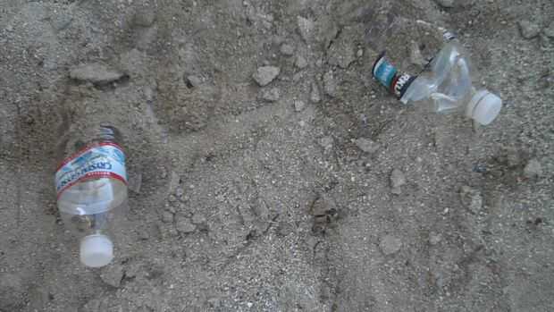 Necesita 2 botellas de agua. (Si encuentra alguno en la naturaleza) Alguna cinta adhesiva o cinta de enmascarar (siempre llevan algunos en cualquier tipo de viaje al aire libre) Algunos sucio agua u orina (¡ realmente!) Montón de luz del sol
