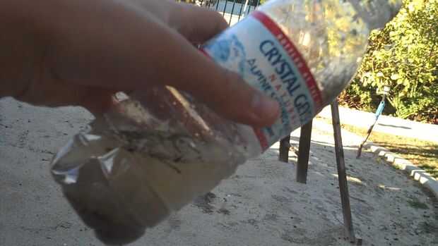 Primero tome 1 botella y llenar con agua sucia. Asegúrese de que no escape fuera de la abertura de la botella cuando a su lado.