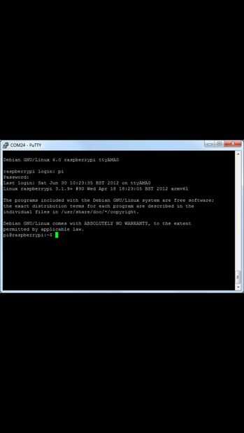 "Inicio de sesión de frambuesa Pi:" el usuario predeterminado es Pi. Escríbelo y presiona enter. La contraseña predeterminada es frambuesa. Tenga en cuenta que cuando se escribe no verá asteriscos ni personajes. Es sólo una característica de seguridad de Linux. Después de introducir su contraseña, verá "pi" para arrancar en el tipo de interfaz gráfica "startx"