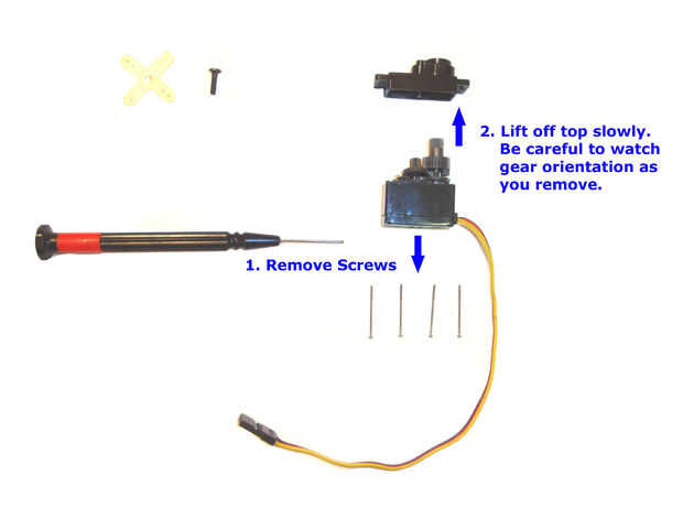 Con un destornillador pequeño de precisión Remueva los 4 tornillos debajo de la caja. Hacerlo poco a poco los tornillos tienen una tendencia a pelar fácilmente. Ahora para levantar cuidadosamente la parte superior de la caja prestando atención al equipo de orientación. Todos los engranajes se salen de la parte superior. Si no, simplemente tire cualquier engranajes que no han permanecido intactos. También, si usted sufre de "memoria a muy corto plazo" esto estaría un buen momento para tomar una instantánea de la orientación de cambios utilizando una cámara digital por lo que se puede volver a montar todo sin volverme loco. Confía en mí, en realidad lo empeora con servos más pequeños.