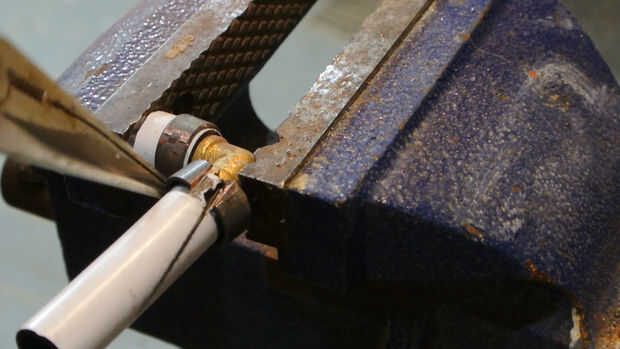 Primer paso es cortar el anillo de cobre con cualquier número de herramientas, si hay sala de una sierra de mano funciona y si el espacio es limitado una Dremel con corte disco es ideal. Si usted tiene un mayor número de conexiones para eliminar encontrar usando una mini amoladora con disco de zip es super rápido. Esto puede hacerse en el lugar o en su banco de trabajo. Cuidado de no cortar la conexión de lengüeta de latón.
