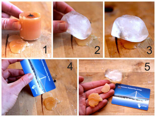 - Tome su tarjeta de plástico, y raspar suavemente la cera endurecida en su superficie de madera. Debe venir dentro de segundos, si no es reemplazar el cubo de hielo y esperar un largo periodo de tiempo antes de intentar raspar la cera. Usar las tarjetas de plástico para que se minimice el riesgo de raspar la mesa o superficie de.