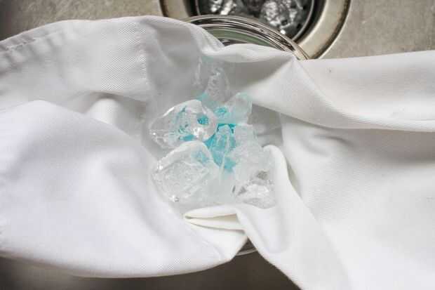 Saque dos cubos de hielo. Me gusta usar cubiteras anticuado porque producen hielo con una tapa plana y un fondo plano, pero no cualquier hielo! Utilice un recipiente para contener el hielo y la ropa si no se acumula el hielo - ver más abajo.