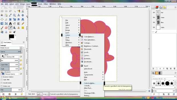 Ahora haga clic derecho en la imagen, ir a colores (o colores en este caso) y luego ir a "Color a alfa". También puede usar la barra en la parte superior. Esta es la opción que elimina el fondo blanco por lo que es transparente.