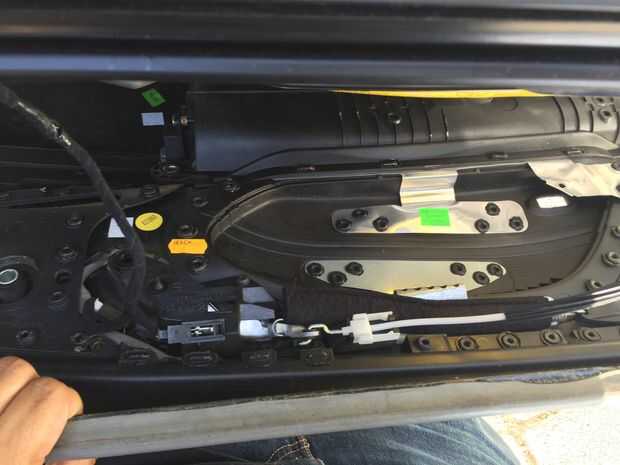 El cable de la manija de la puerta se quita cuidadosamente abrir el conector blanco para que sus dientes están libres y deslizando hacia atrás. Hay un metal rectangular gancho en el extremo del cable de liberación que ahora puede ser maniobrado libre de la manija de la puerta.