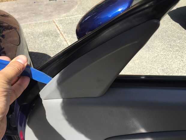 Utilice la herramienta para tariceria retirar el guarnecido superior. En el lado del conductor, este recorte tendrá los controles de espejo. La parte superior de la pieza de adorno triangular se desliza en el sello de tiempo de caucho. Palanca de la parte inferior, luego levante y recordar esto cuando vuelva a instalar.