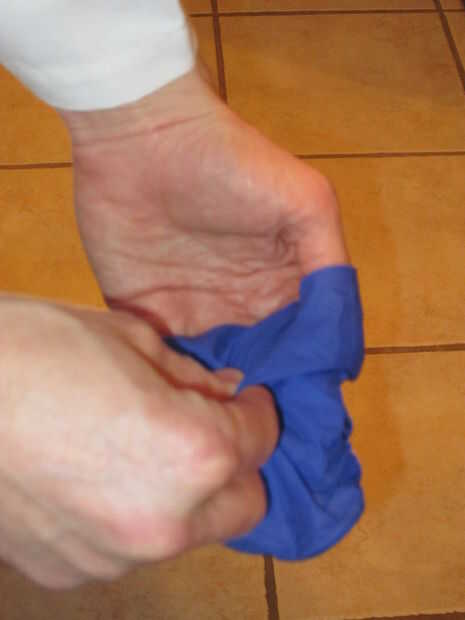 Tome el doblez del guante y sacarlo completamente de la mano.  Una vez más, tenga cuidado de no voltear todas las partículas que pueden contaminar la zona.  Muchos gérmenes se propagan cuando se quita el equipo de protección personal.