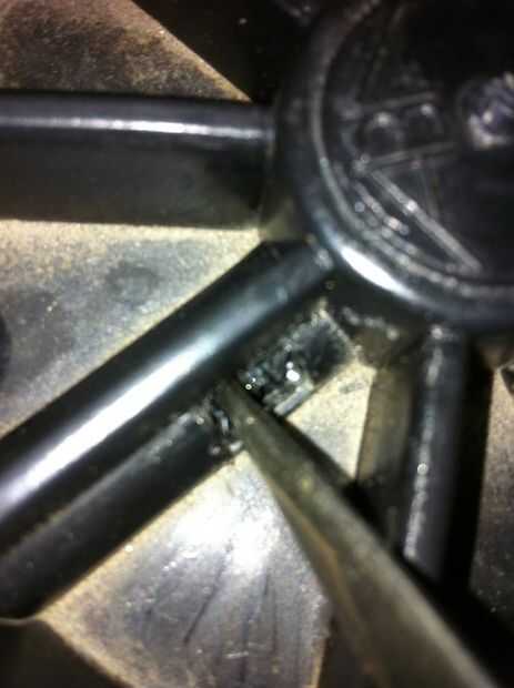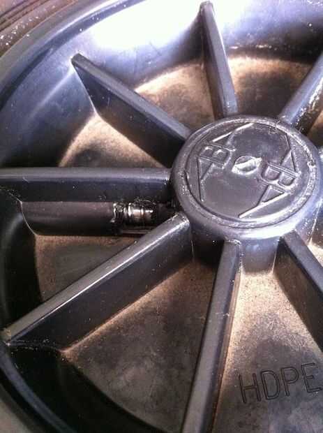 Usando algo puntiagudo pero no agudo (utilicé un abridor souvenir de Madrid), deslice el muelle y estirón del centro de la rueda para liberar la rueda del eje.