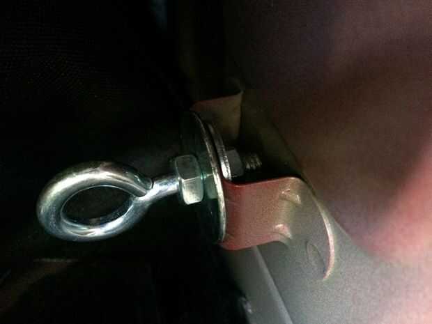 El perno para la correa de hombro casualmente tiene suficiente espacio para meter un bucle de paracord alrededor de él. Usé un nudo de enganche de la línea tensa para garantizar al perno en las dos primeras fotos. Até el otro enganche de línea tensa en el otro extremo para conectar una cuerda del amortiguador auxiliar a. El enganche de la línea tensa es un nudo excelente ya que se puede deslizar hacia arriba o hacia abajo para tensar cualquier. Las 3 últimas fotos muestran cómo instalé un perno de ojo de 1/4" a través de uno de los puntos de fijación de anclaje en la pared posterior de la parte inferior. Utilicé una tuerca y una arandela grande en el exterior, y una arandela más pequeño seguido por una tuerca en el interior. Los pasadores de goma fueron enganchados en el perno de ojo y luego conectados a un bucle en el extremo de la paracord. Fácilmente podría colocar una carga neta de una manera similar.