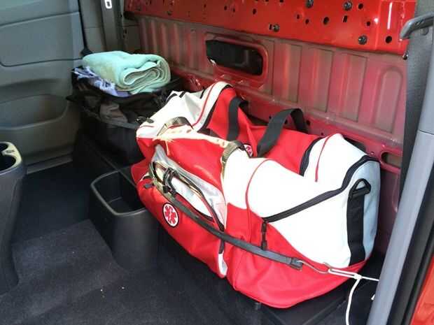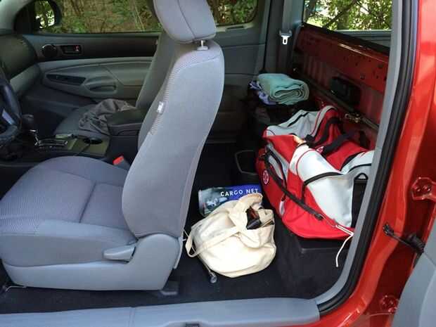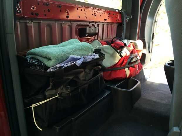 Esto es lo que las cosas se ven ahora con mi bolsa de herramientas y primeros auxilios bolsa asegurada por cuerdas elásticas. Todavía hay mucho espacio en el piso para mi jumper cables y hierro del neumático. Probablemente voy a construir una plataforma sobre las bolsas eventualmente a utilizar más el espacio vertical y mantener mis cosas fuera de la vista. La cabina será perceptiblemente más fuerte sin el panel posterior, y cuenta con menos aislamiento que él hizo antes. Este podría ser un problema durante el invierno dependiendo de donde usted vive. Puede colgar una manta o utilice alfombras para remediarlo.