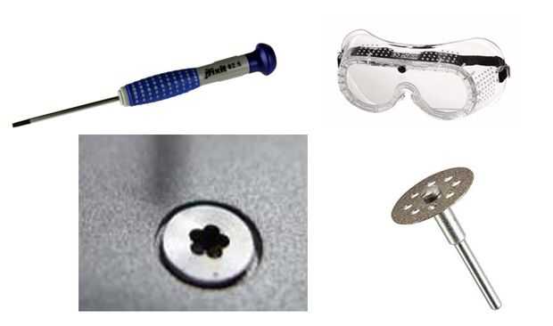 • Un aparato con los tornillos pentalobe que desea quitar, preferiblemente uno que tiene la cabeza que. • Un plano conductor • Una rueda corte de dremel, pequeño • Y alguna protección para los ojos.