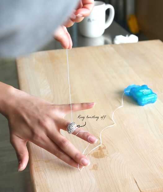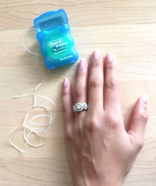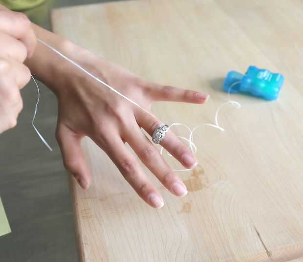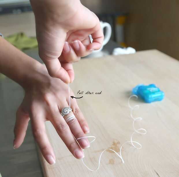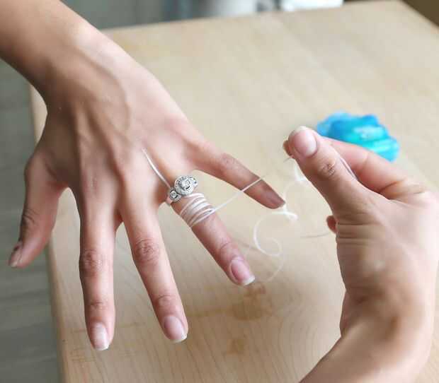 Este proceso es más mecánico que los otros, pero seguramente debe alcanzar donde otros han fracasado. Abrigo encerado hilo dental alrededor de tu dedo encima de donde se encuentra el anillo. Asegúrese de que el hilo se envuelve suavemente y uniformemente más allá de la articulación inferior, que es probablemente el punto que su anillo no puede ir más allá. Meter un extremo pequeño debajo de barril del anillo. Con este fin, empezar a desenvolver el hilo; Esto será forzar manualmente el anillo de giro hacia arriba mientras sin darse cuenta que encoge del tamaño de su nudillo ligeramente.