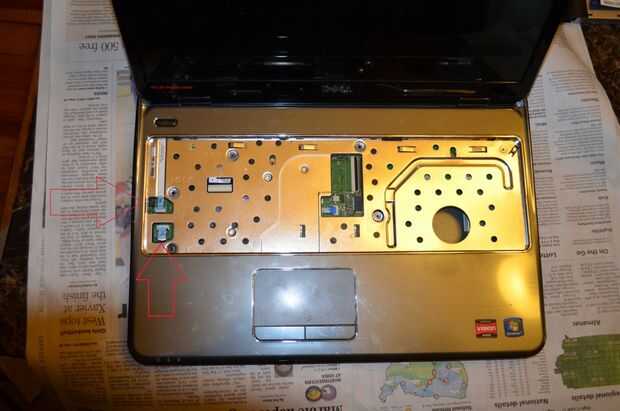 Se necesita extraer la placa ve aquí para tener acceso al disco duro.  En primer lugar, desconecte las tiras indicadas por las flechas rojas (ver siguiente paso).