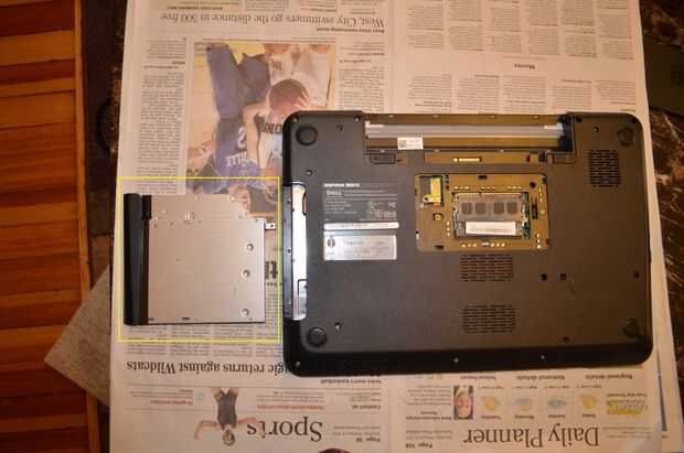 Quitar el lector de CD/DVD (indicado en amarillo) simplemente sacándose toda la unidad.