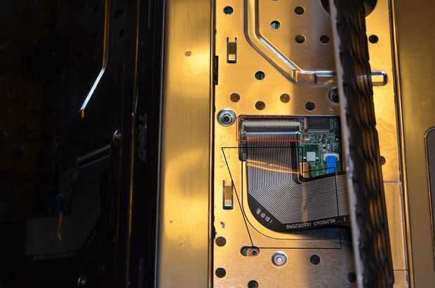 Una vez que el teclado es liberado de todas las 4 fichas, levante el teclado para revelar el cable del teclado (contorneado en negro).  El cable es muy fino así que tenga cuidado y no intente lo jale hacia fuera (a menos que no piense en volver a usar el teclado).  Levante la lengüeta del conector negro (contorneada en color rojo) para quitar el cable.