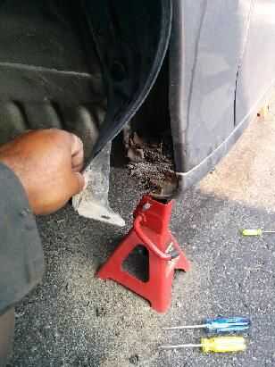 No hay que quitar toda la pieza de plástico, pero basta con retirar los tornillos del guardabarros delantero de plástico bien del cuerpo del coche y tirar el plástico suelta un poco para que pueda ver detrás de él. Usted tendrá que poner un destornillador o trinquete y una llave de 10mm en la parte delantera debajo del tope poco por lo que tendrá el espacio.
