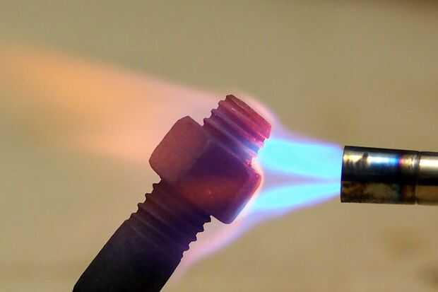 Nuestro siguiente paso es utilizar un soplete para calentar el tornillo. La idea es tener un lado de nuestro perno de expansión del calor y romper el óxido. Esto puede hacerse fácilmente con un soplete de propano pequeño. Ten cuidado, este método va a arruinar el tratamiento térmico en los pernos más fuerte.