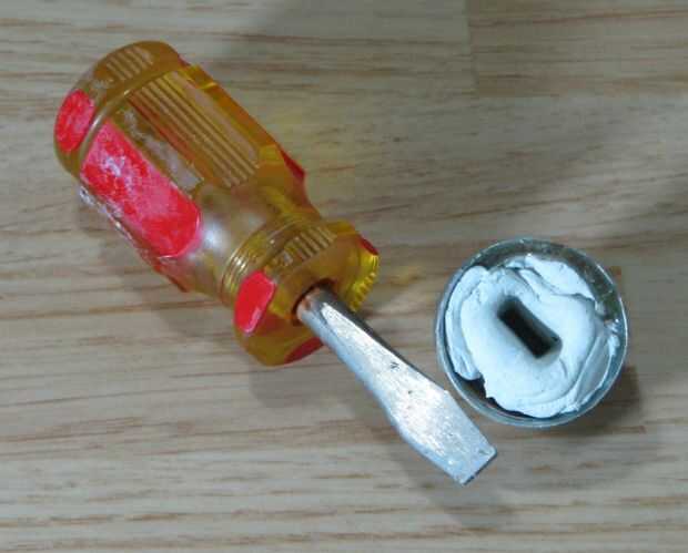 Mientras que el epoxi es todavía suave meter el destornillador en el epoxi haciendo una cavidad oblonga. Espere a que el epoxy se endurezca completamente. ahora eso cavidad simplemente utilizar el destornillador para destornillar el muñón de la bombilla.