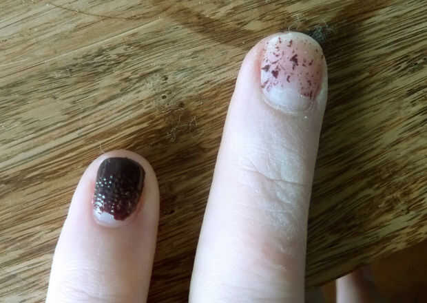 La imagen aquí muestra un dedo después de haber empapado en base de acetona quitaesmalte y el otro en la acetona, por 20 minutos. El quitaesmalte no parece tener mucho efecto en absoluto.
