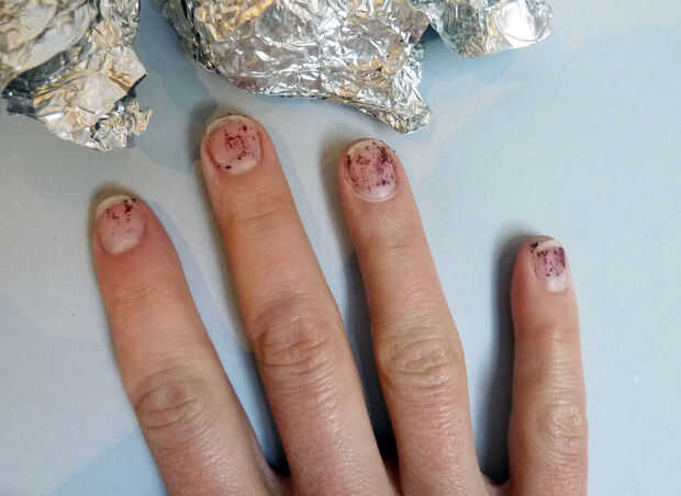 Incluso 30 minutos de esta técnica no quite todo el pulimento limpiamente, pero aflojar todos de ella. Terminé mi retiro de manicura por raspado los restos con el borde romo de un cuchillo de plástico.
