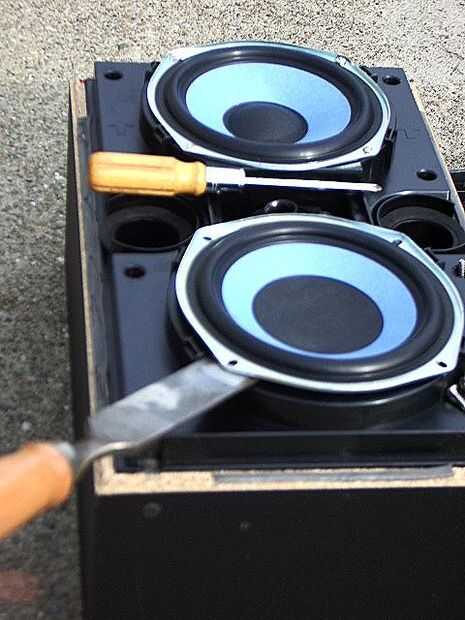 Un altavoz de cono fue eliminado, quitando cuatro tornillos de cabeza phillips y apalancar suavemente apagado con el cincel de madera afilado, cara ancha, hasta que libere de un sello de Junta de espuma. Nuevamente, asegúrese de no dañar este sello de espuma evita vibraciones, así como proporciona un sello hermético de sonido para el recinto del altavoz. La rejilla de altavoz plástico moldeado y gabinete de altavoz cuidadosamente están diseñados para permitir el sonido escapar de una manera controlada y restringida, para maximizar el sonido. Y las juntas/juntas de espuma asegurar esto.
