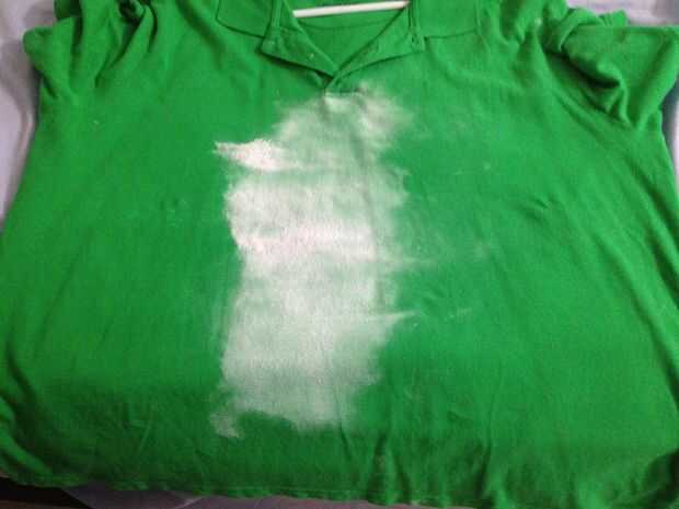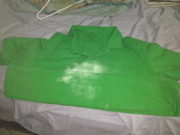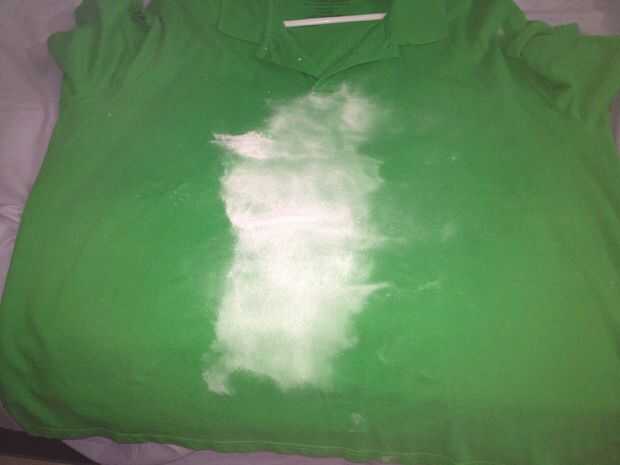 Por lo que me dijeron que para que este truco trabajar, es importante no frotar el polvo. Polvo ligeramente la mancha con el suficiente polvo para cubrir la mancha. Mayoría en polvo del bebé viene en una botella similar a la imagen adjunta con una tapa perforada. Va a evitar que una aplicación directa si polvo a la mancha. Mi recomendación es que la Mancha alrededor del anillo de polvo que salen de esta tapa de centro. Luego tomar la camisa y tirando ligeramente la camisa hasta que el polvo se mueve sobre la mancha y el talco es absorbido por la tela. Tire de la tela para que el polvo esté en cada pliegue de la tela teñida. Asegúrese de que la mancha es cubierta y plegar a la tela. Tienda de 6 a 24 horas.