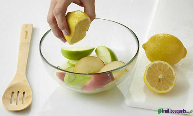 • Para ello, coloque las rodajas de manzana en un recipiente y exprime un limón sobre las rebanadas de 2.