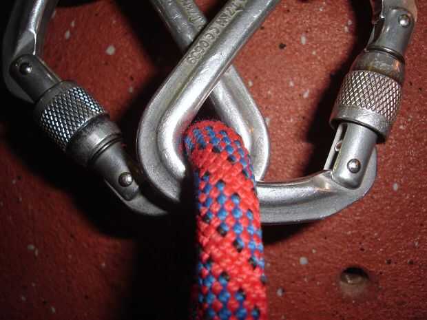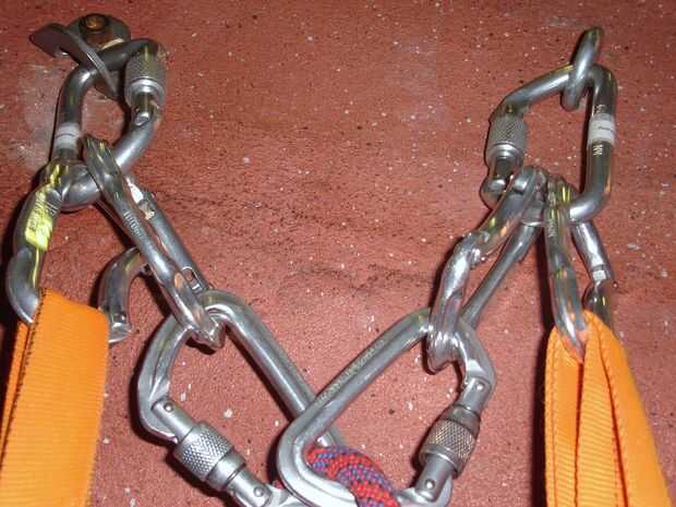 Algunas cuerdas superior serán envueltas alrededor de una "barra de peso" en la parte superior de la pared de escalada. Estas barras tendrá dos "agujeros" en cada lado de la barra. Puedes tomar uno de los mosquetones a la cinta de su accesorio lazo y clip en un lado y el otro mosquetón de la otra cinta en el otro lado de la barra de peso. Asegúrese de bloquear sus mosquetones.