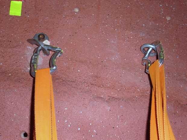 Algunas cuerdas superior será configuración mediante dos mosquetones de drenaje rápido (la mayoría tendrá el mosquetón de liberación rápida substituido con mosquetones de bloqueo en una configuración permanente). Usted se desconectar uno de los mosquetones acoplados a la cinta de su accesorio lazo, clip en uno de los anclajes y desenganche el otro mosquetón de su accesorio lazo y fíjela al otra ancla. Asegúrese de bloquear sus mosquetones.