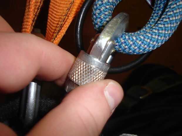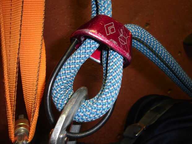Después de ambos extremos de la cuerda en el piso, usted tomará el mosquetón y el ATC belay dispositivo de su accesorio lazo y fije el anillo ventral del arnés. (Puede adjuntar a la entrepierna y lazo de aseguramiento, pero hace casi imposible poner las cuerdas a través de, por lo que no recomiendo a menos que usted ha tenido alguna experiencia trabajando con las cuerdas mientras que conectados a ellos).