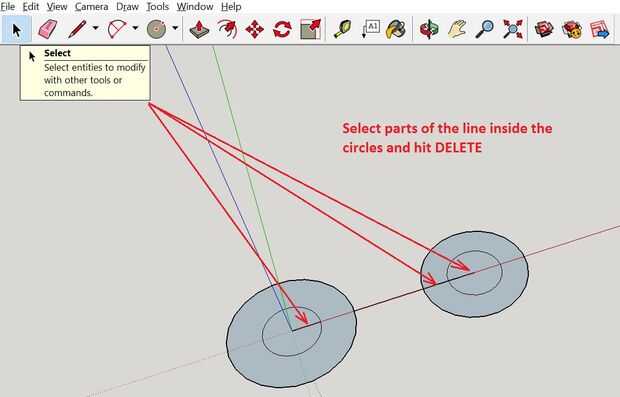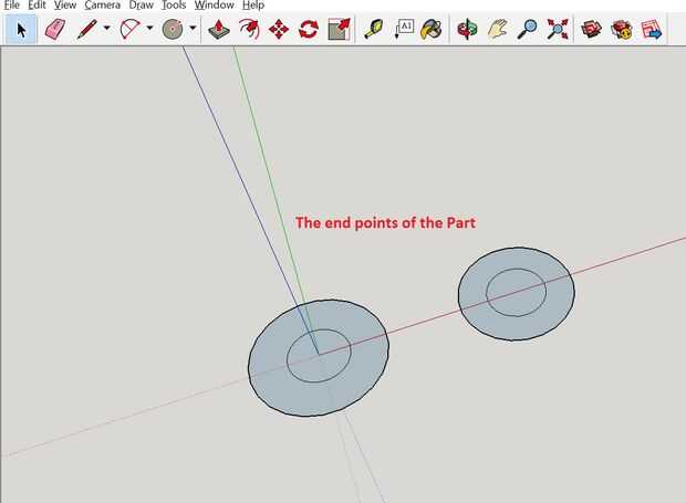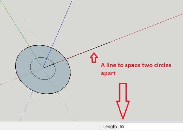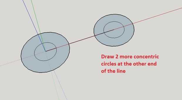 - Para ello, utilice la herramienta línea para dibujar una línea desde el centro del primer par de círculos - arrastrar la línea a lo largo del eje rojo hasta que estés satisfecho con la longitud de la parte