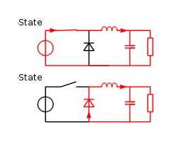 Cuando el interruptor está cerrado, la corriente fluye a través de la carga y filtro de condensadores a través de un inductor. Cuando se alcanza la tensión especificada en el capacitor, el interruptor se abre. El inductor y el condensador entonces entregan energía a la carga a través de un diodo flyback hasta la tensión de caídas bastante que el circuito de control se enciende una vez más el MOSFET.