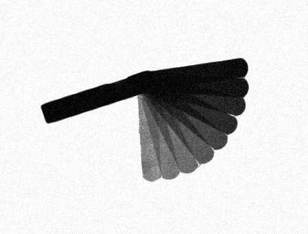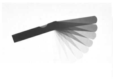 [Imagen 1] es una radiografía de un calibrador de acero, para un kVp apropiado para el trabajo. Aviso que todos los indicadores son visibles, albiet con los ligeros un poco difíciles de ver.