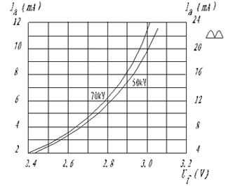 Convenientemente, estos tubos vienen generalmente con algunos gráficos para ayudar a una establecer parámetros para el diseño de una máquina; [imagen 1] muestra a la relación entre el voltaje del calentador y el ánodo actual para el tubo que he elegido. De lo que dice la curva, uno debe aplicar 2, 6V para el calentador para permitir una decente 3mA fluya a través del ánodo del tubo. Mientras que 3mA no puede sonar como mucho del actual, a los 75, 000V que es un respetable 225 watts de potencia! Asumiendo una eficiencia típica de 3%, esto equivaldría a 6.7W de energía de rayos x hacia fuera.