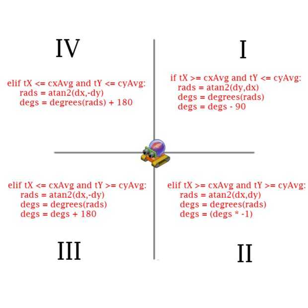 156-177: Aquí estamos tratando de encontrar el ángulo entre el robot y su destino. Básicamente dividimos toda la pantalla en cuatro cuadrantes, pero siempre utilizando centroide del robot como el punto de origen. Luego calculamos la pendiente entre X del objetivo y Y (tY, tX) y el robot X y Y (cxAvg y cyAvg).