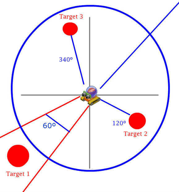 198: Comparar intHeadingDeg, que es ángulo de partida del robot, con targetDegs, que es el ángulo entre el robot y el destino. Pero hacer esto + o - 30 º. Esto significa que el robot no tiene que tienen su título ángulo exactamente el mismo como el ángulo de la meta. Sólo necesitará aproximadamente estar apuntando en la dirección correcta.