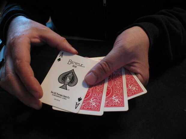 En cambio, vamos a mostrar la A.S. como da vuelta cara arriba, al igual que nos mostró el "as de corazones" que gire la cara hacia abajo: por pulgar en la parte superior 3 tarjetas de uno en uno en la mano izquierda, terminando con un "doble" en el lado derecho del ventilador.
