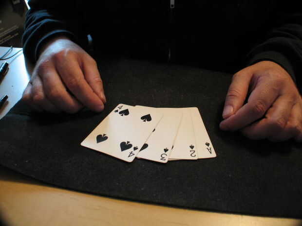 Como usted la cuenta "2, 3 y 4" va a entregar los 2, 3 y 4 de espadas y ponlos encima de la ace, formando un ventilador poco agradable de cartas sobre la mesa. Esto se hace correctamente, se ve muy bien y si alguien llega a las tarjetas a verlos es una buena idea de cortar la mano con el cuchilla de la carne en el bolsillo. Llevan una cuchilla de la carne con usted cuando realice magia, ¿verdad? Sí. Mantiene los dedos de mis tarjetas...