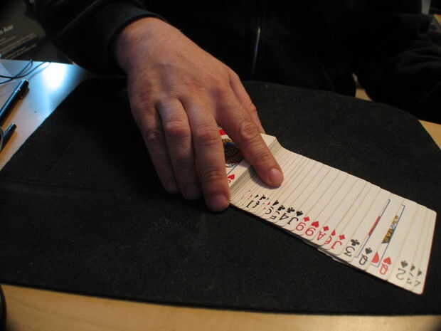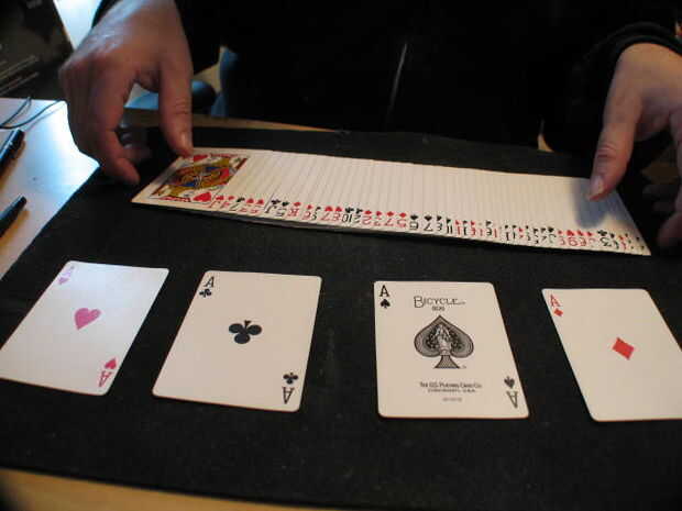 Así que después de sacar los ases y ponerlos sobre la mesa delante de usted, el siguiente paso es levantarse un poco de trabajo sucio de conjunto con la cubierta en su mano izquierda.