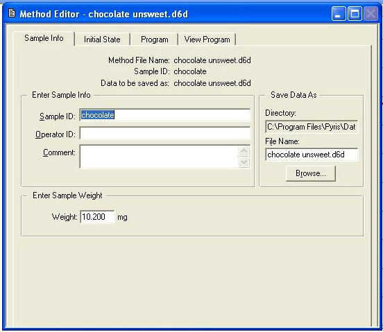 Por lo general, el programa Pyris (programa que registra los datos del análisis) se abre en el ordenador conectado a la máquina de DSC, por lo que ya debe ser abre automáticamente. En orden para el programa guardar la información obtenida en su análisis de DSC, debe dar su muestra de un nombre en el cuadro "ID de muestra". En el ejemplo anterior, el nombre de la muestra es "Chocolate". Es mejor elegir un nombre relevante a la muestra por lo que se pueden recuperar los datos correctos en un momento posterior. Además, introduzca un nombre de archivo en el cuadro "Nombre de archivo" y haga clic en el botón "Navegar..." para encontrar un lugar en el equipo para guardar los datos. El "Nombre de archivo" y "Muestra ID" pueden ser lo mismo si lo desea. Además, el programa requiere la masa de la muestra para obtener datos precisos. Introduzca esta información en el cuadro de "muestra del peso" en la foto superior.