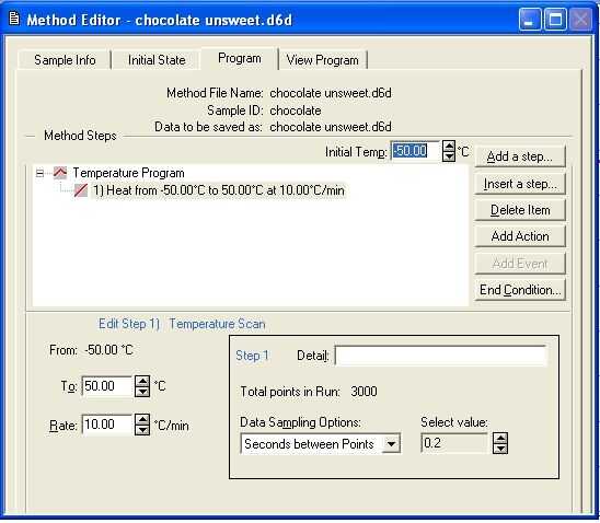 Para hacer el calentamiento y el ciclo de enfriamiento, crear pasos bajo la pestaña "Programa" en la parte superior de la programa. Para crear un paso, haga clic en el botón "Añadir a... de paso" a la derecha de la ventana. Establecer la temperatura final que desea alcanzar al final de ese paso en el "para:" espacio. Por ejemplo, si quiero calor desde el valor inicial de 30 grados centígrados a 185 grados Celsius en el paso uno, entrarían "185" en este cuadro. También debe elegir un tipo de calefacción o refrigeración para cada paso. 10 grados centígrados por minuto es un precio razonable para la mayoría de polímeros, pero puede ser mejor ver este valor en línea para su polímero específico. Si tu tarifa no está ya configurada en el valor deseado, ingrese en el "tipo:" caja. Siguen pasos hasta que usted ha hecho un programa que se caliente y enfríe su muestra el número deseado de veces. Un ciclo de calefacción y refrigeración que se repite dos veces es una buena regla para asegurarse de que nada salió mal la primera vez.