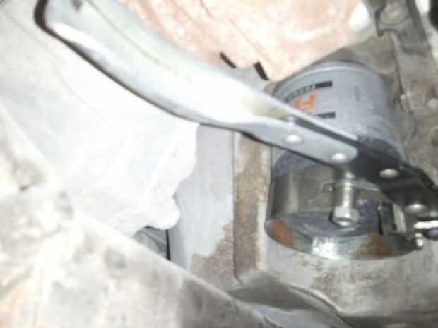 Desenroscar el filtro de aceite viejo con trapos y llave del filtro.