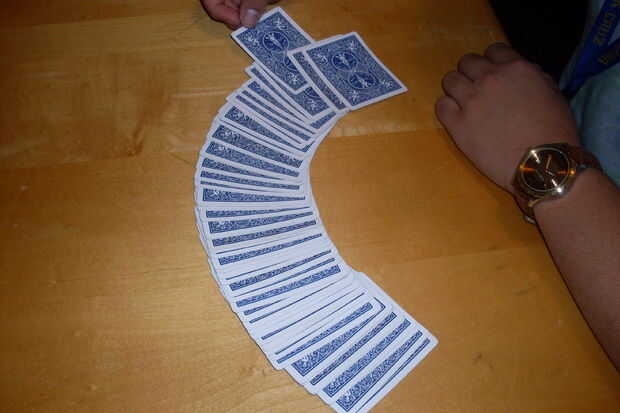 Del ventilador hacia fuera las tarjetas y elegir una tarjeta para el jugador ver. IMPORTANTE: Debe elegir la tercera carta de la derecha, que es el siete de corazones; de lo contrario, no funcionará el truco. Esto asegura que usted sabe lo que su tarjeta es partir de este punto.