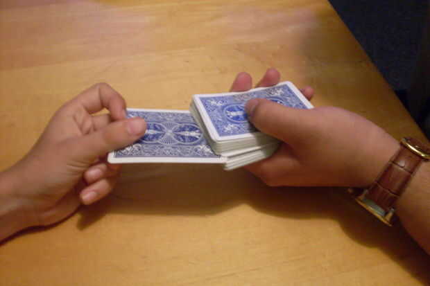 Dar la tarjeta a la adivina y se le muestran a nadie. La mirada o cerrar los ojos (o ambos) para asegurar a su turno que no quiere. Haga que vuelva a colocar la tarjeta en la cubierta, en cualquier lugar de la cubierta. Para efecto añadido, tiene turno aleatorio la cubierta además de tu shuffle.
