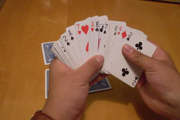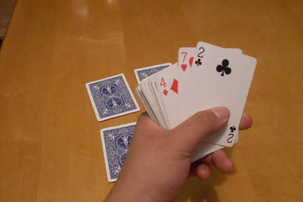 Este es el tiempo final se "busca" su tarjeta ". Localice el siete de corazones. Coloque lo que está ahora detrás de la cara primera tarjeta en la cubierta, como se muestra en la segunda foto. En este caso la cara primera tarjeta en la cubierta es un dos de espadas.