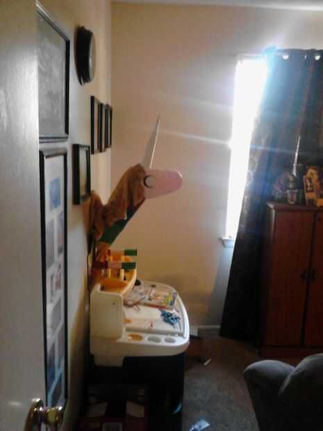 Y hace cabeza de la señora Rainacorn un divertido adorno de pared! Pernos de empuje simple/chinchetas sostiene bien. Deseo habría salvado a los lados del arco iris y que se vean como si vienen de y volver en las paredes en toda la casa, así parece que la señora es progresivamente a través de las paredes como lo hace en el show montado. Tal vez puedo hago que ocurra de todas formas si consigo algo de tiempo. Pero si lo haces, por favor enviar fotos para ver lo que ve!