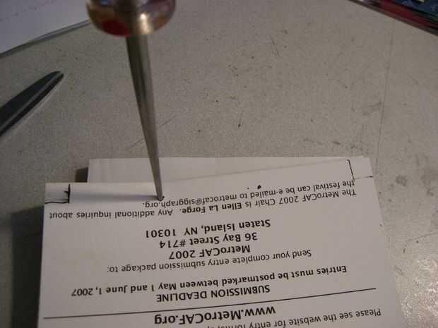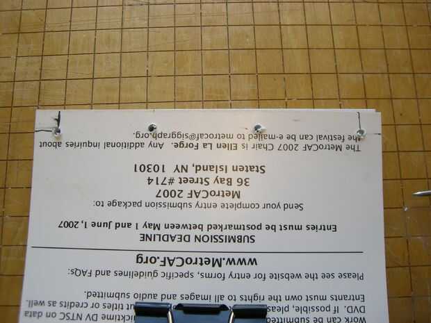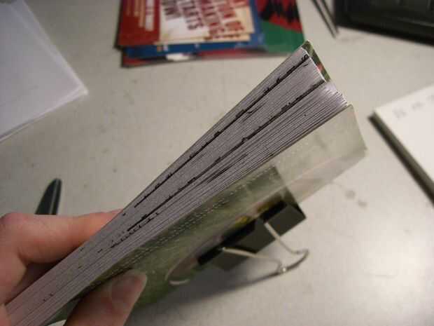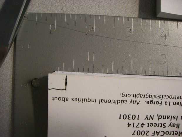Marca de 3/8" desde ambas esquinas para ser enlazado (el lado doblado de las hojas). Dividir el espacio a lo largo de las uniones entre estas marcas en tercios y marque las ubicaciones. Estas son donde hacer los agujeros para el atascamiento de la guita.