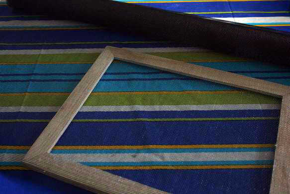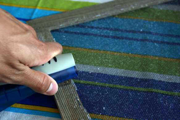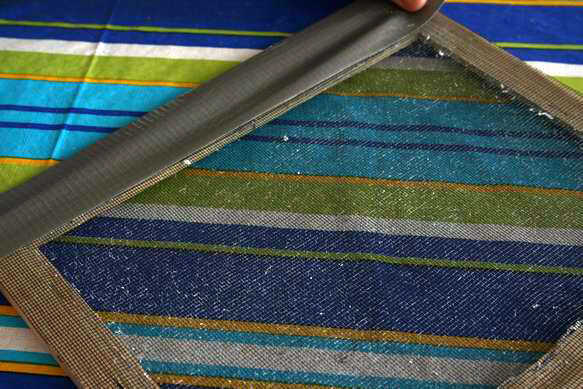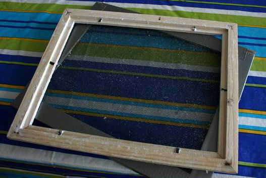 Para ello, obtener uno de los marcos y poner sobre una mesa, con el lado liso hacia arriba (el lado sin las ranuras donde se coloque la parte posterior del marco). Haz tu malla/red y ponerlo en la parte superior del marco de imagen. Cortar una pieza que coincida aproximadamente con el tamaño del marco.