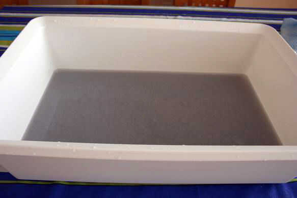 Volcar esta pasta de papel en la tina grande y agregue agua para que cubra el molde y barbas (uno encima del otro) horizontalmente.