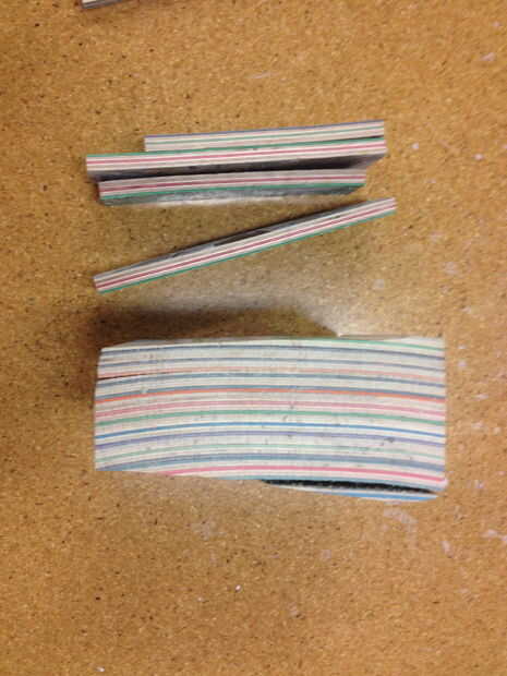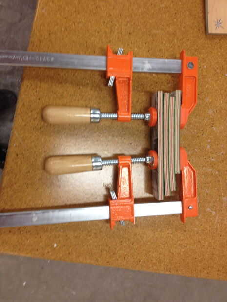Difundir algún pegamento de madera entre cada capa y haz algunas abrazaderas! cuanto más mejor. Si usted pega diferentes partes del tablero con diferentes concaves el bloque entero delaminate dentro de algunos días de pegado. 2 secciones de tableros diferentes con distinta cóncavo es aceptable.